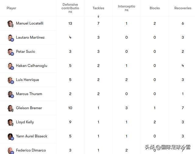 以此战为例,抢断榜单上,洛卡特里(7)是国米三名首发中前卫苏契奇(3)、泽林斯基(0)、巴雷拉(0)同比数据之和的两倍还多。