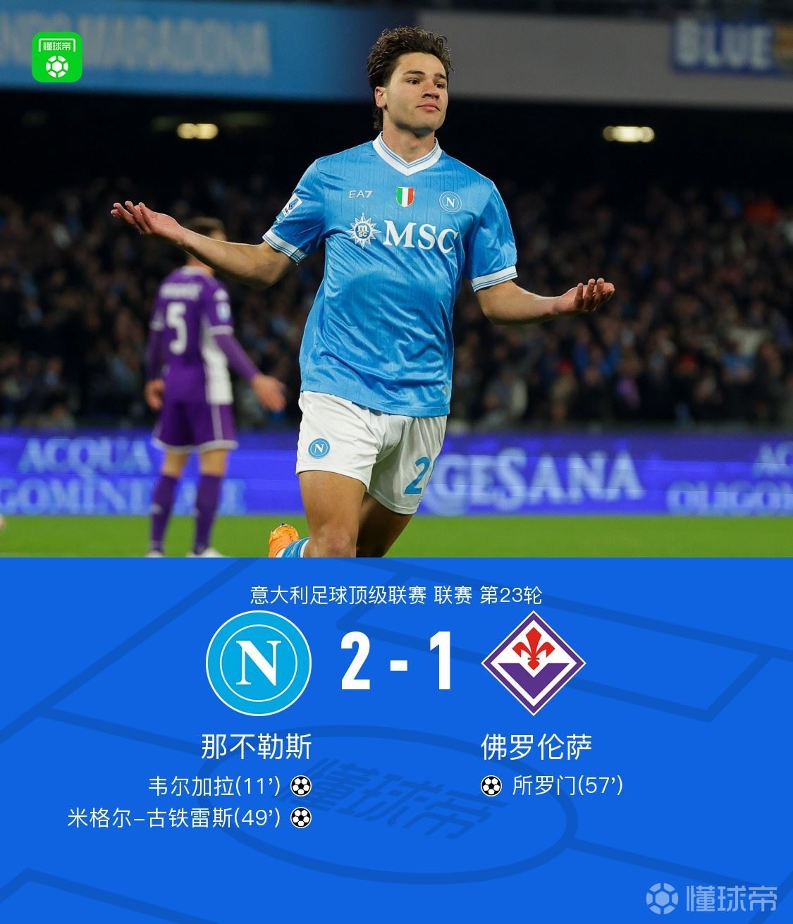 那不勒斯2-1佛罗伦萨,韦尔加拉、古铁雷斯建功 北京时间2月1日意大利足球顶级联赛第23轮,那不勒斯主场对阵佛罗伦萨。上半场,韦尔加拉单刀冷静破门。下半场,古铁雷斯禁区内兜射,扩大优势,随后,所罗门门前补射进球,扳回一城。最 2026-02-01