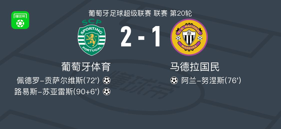 葡萄牙体育2-1马德拉国民,路易斯-苏亚雷斯破门,佩德罗-贡萨尔维斯建功 北京时间2月2日葡萄牙足球超级联赛 联赛 第20轮,葡萄牙体育主场对阵马德拉国民。葡萄牙体育佩德罗-贡萨尔维斯破门,路易斯-苏亚雷斯破门。马德拉国民阿兰-努涅斯破门。最终比 2026-02-02