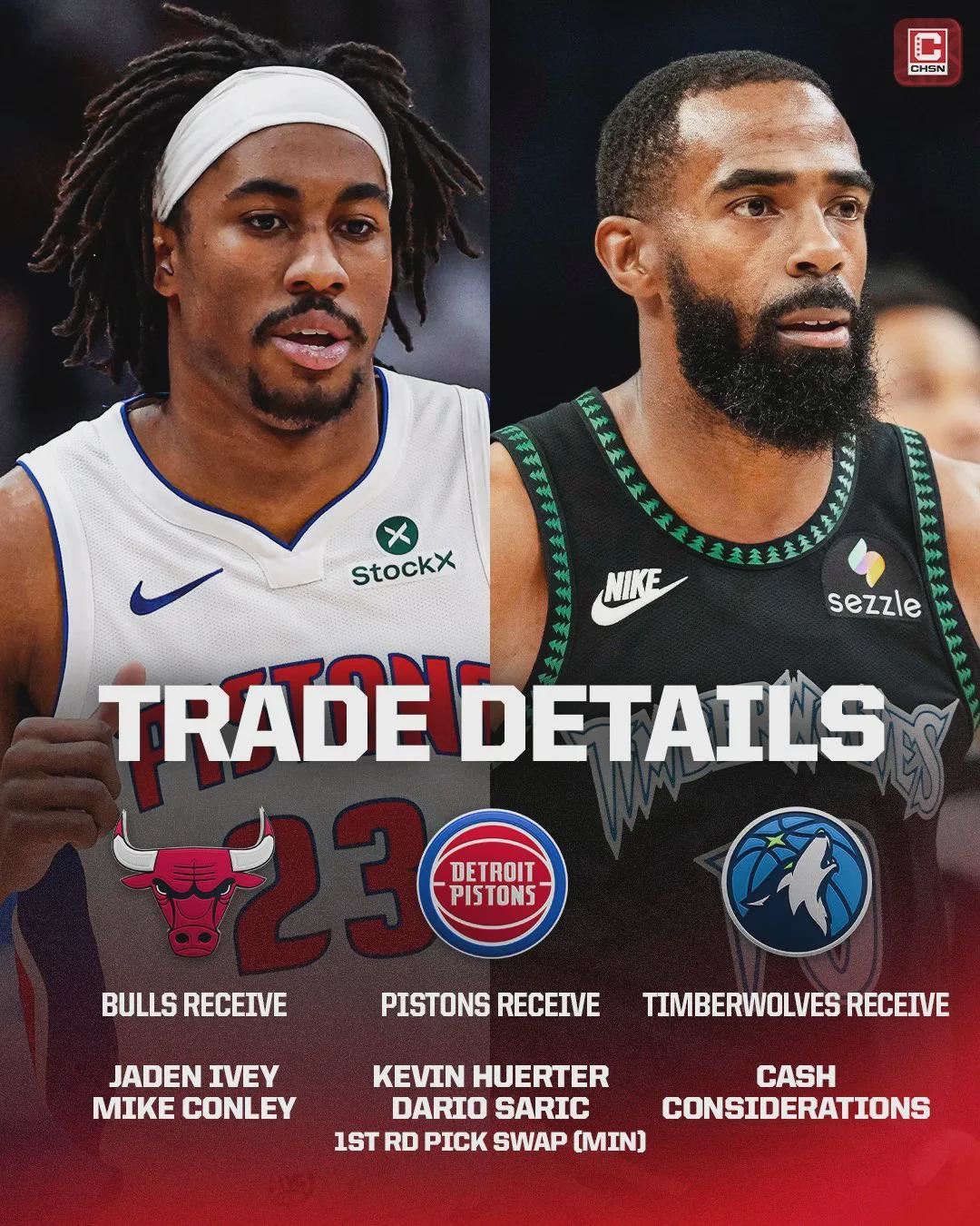 NBA不是有大Z条款吗?为啥康利被裁后还能回归森林狼?别急,我们慢慢来说。今年2月4日,森林狼、活塞和公牛达成三方交易:公牛得到杰登-艾维和迈克-康利;活塞得到许尔特、萨里奇和2026年首轮互换权(来自森林狼)。